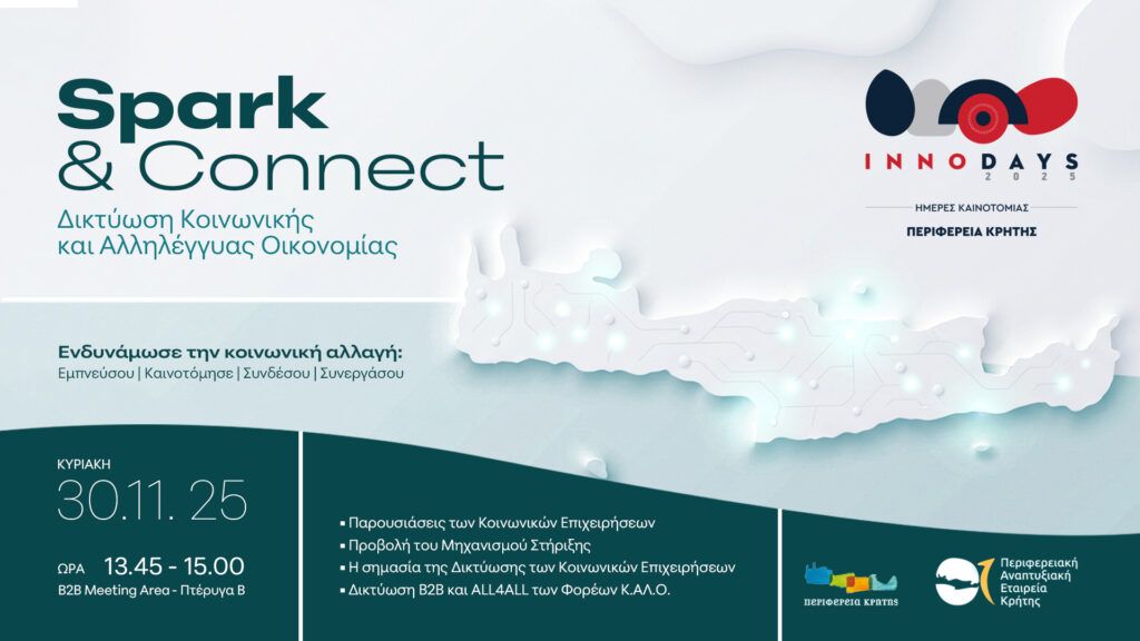 Spark & Connect: Συνάντηση Κοινωνικής και Αλληλέγγυας Οικονομίας Ενδυνάμωσε την κοινωνική αλλαγή: Εμπνεύσου, Καινοτόμησε. Συνδέσου. Συνεργάσου! Ημερομηνία & Ώρα: Κυριακή, 30 Νοεμβρίου 2025 | 13:45 – 15:00 Τοποθεσία:Διεθνές Εκθεσιακό Κέντρο Κρήτης (ΔΕΚΚ) Χώρος συναντήσεων : B2B Meeting Area – Πτέρυγα B Έλα στη συνάντηση που στόχο έχει την ενίσχυση, προβολή και δικτύωση του οικοσυστήματος […]